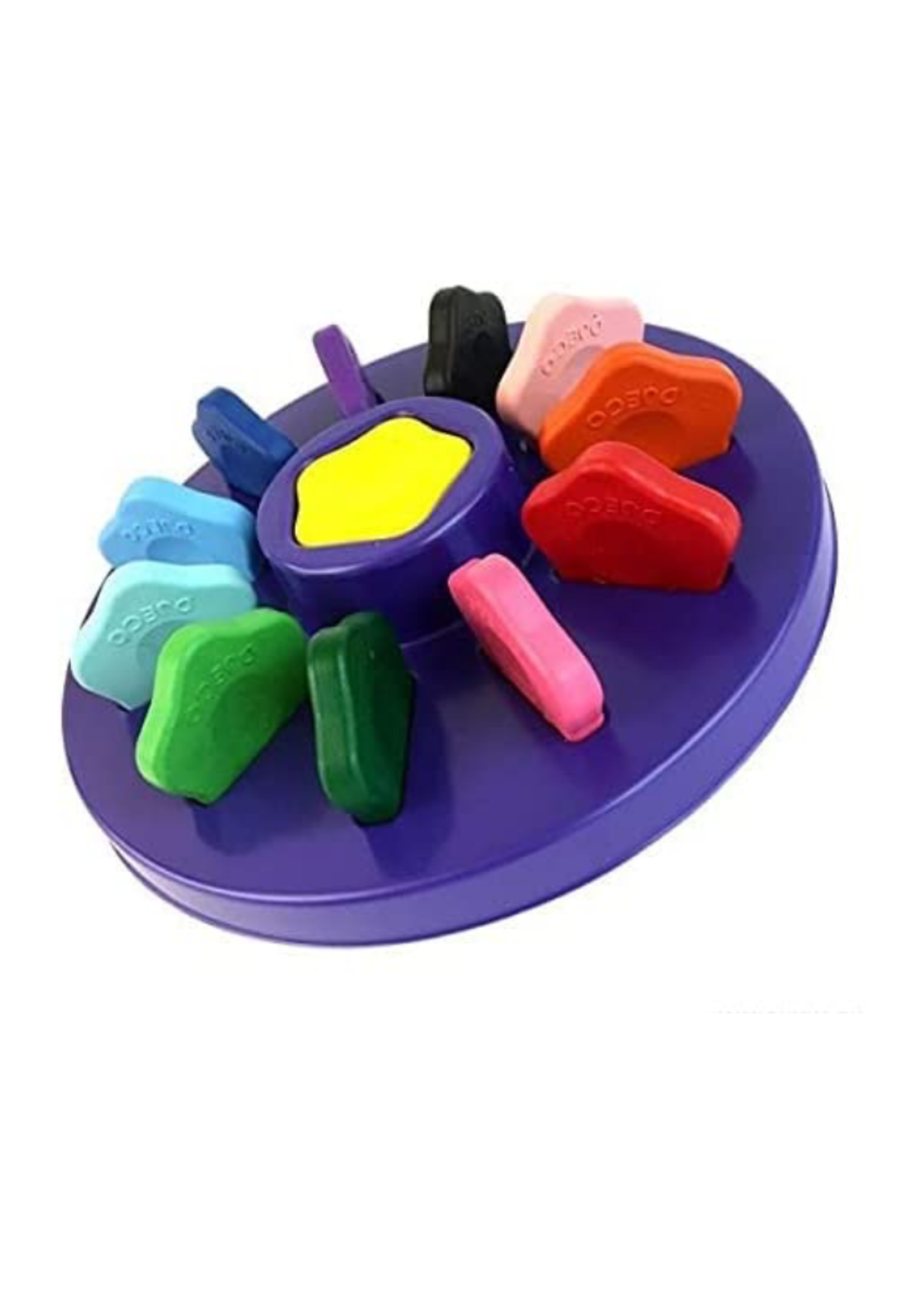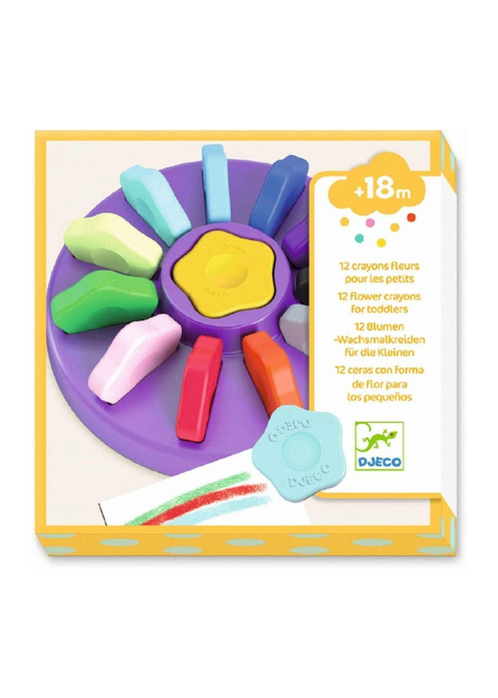 12 قلم تلوين على شكل زهرة بالألوان: الأسود، الأصفر، البرتقالي، الأحمر، الوردي، البنفسجي، الرمادي، الأزرق، الأزرق الداكن، الفيروزي، الأخضر، والأخضر الفاتح.