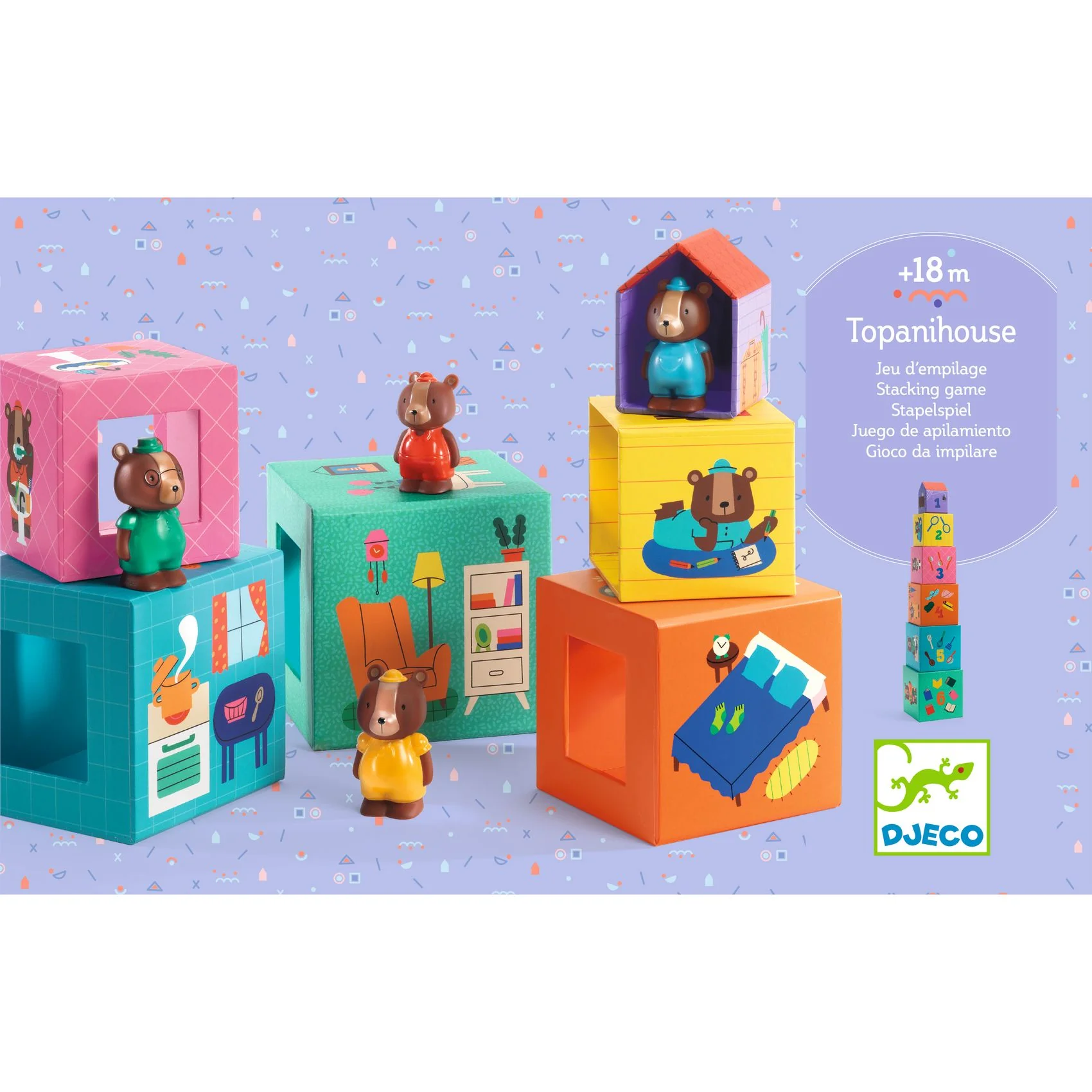 خمسة مكعّبات مصوّرة تحتوي على 4 حيوانات للّعب وبناء منزل جميل. تتعدد طرق اللعب؛ يمكن للأطفال تكديس المكعّبات لتشكيل برج أو تركيبها معًا، كما يمكن اللعب بها على الأرض وإعادة ابتكار تصاميم مختلفة للمنزل، أو اللعب بالحيوانات وحدها. يتيح هذا النشاط الشامل ابتكار قصص ممتعة ومتنوعة.