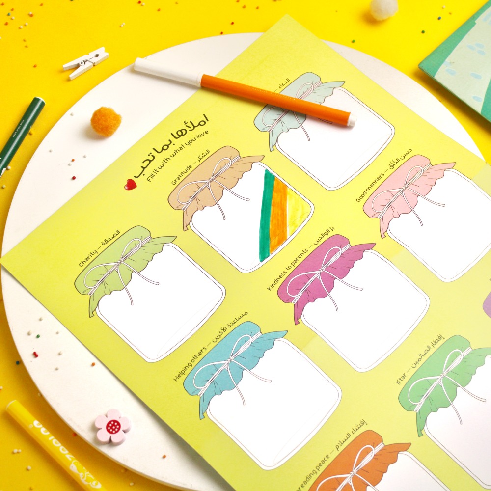6- نشاط “املأها بما تحب”: برطمانات تمثل أعمالًا صالحة، يلوّن الطفل جزءًا منها مع كل عمل صالح حتى تمتلئ جميعها بنهاية الشهر