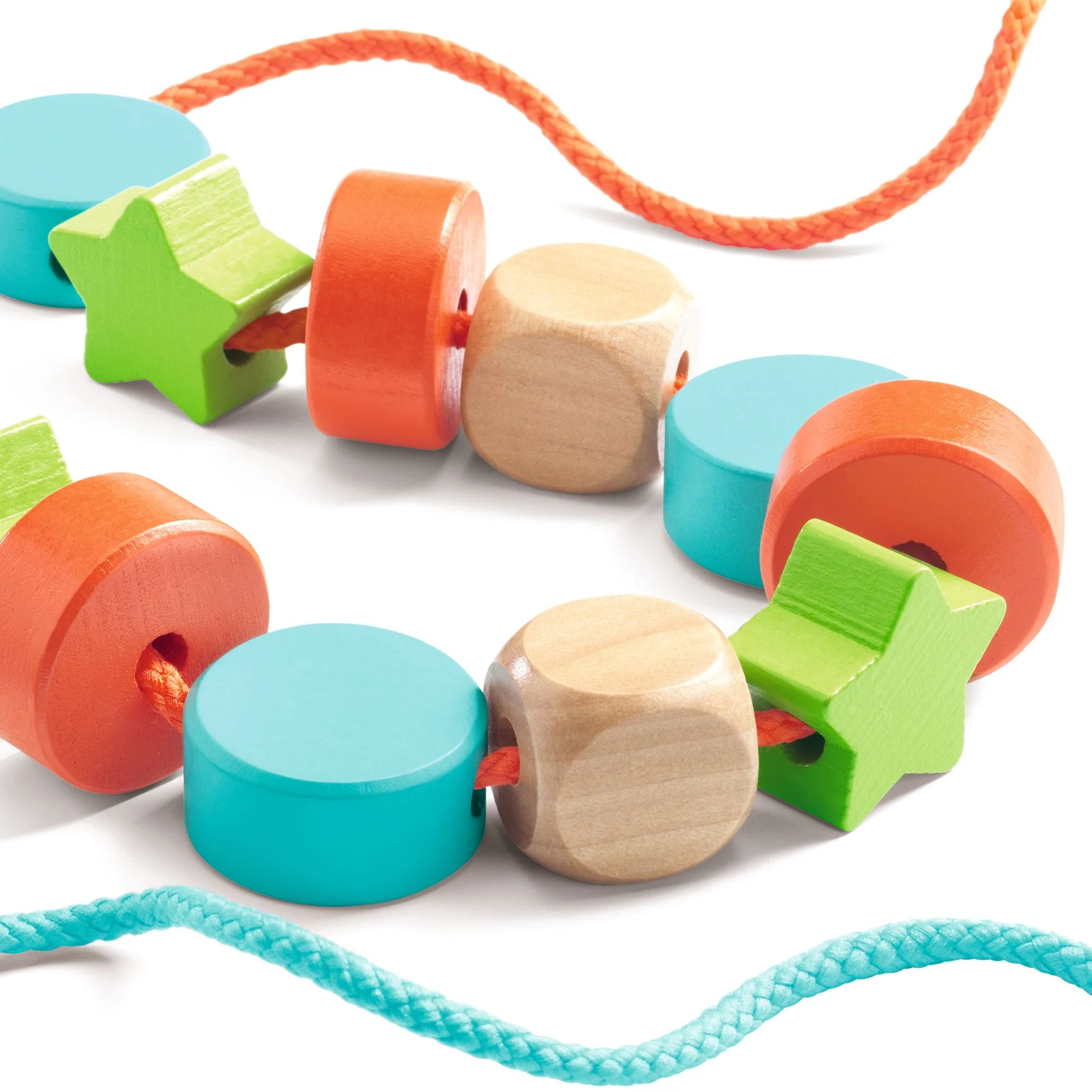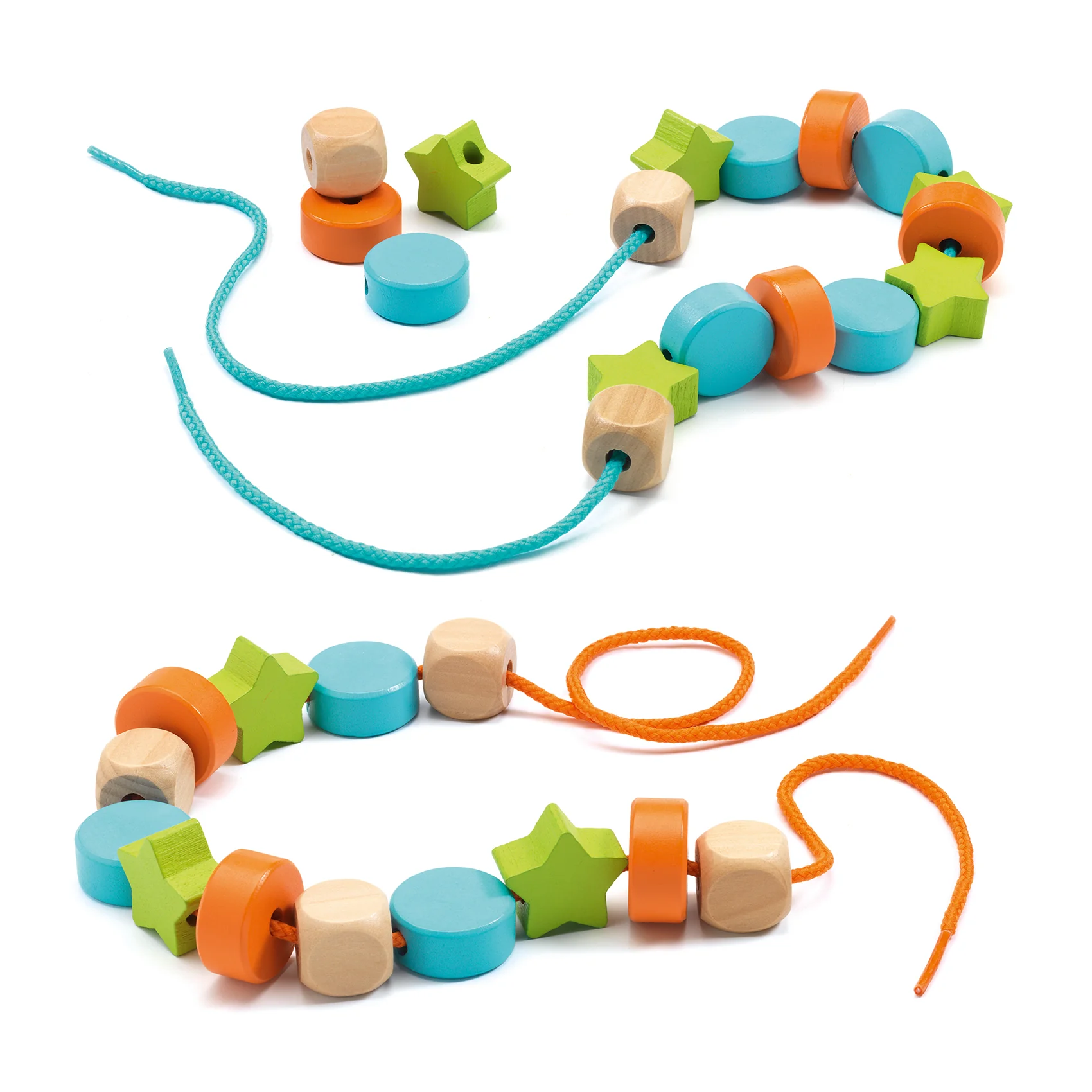 يستمتع الأطفال بتمرير الخرز على الخيطين الملونين، وإطلاق العنان لخيالهم.