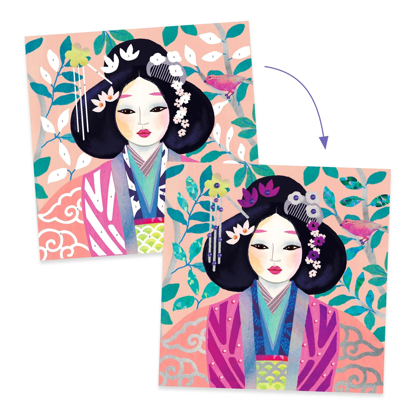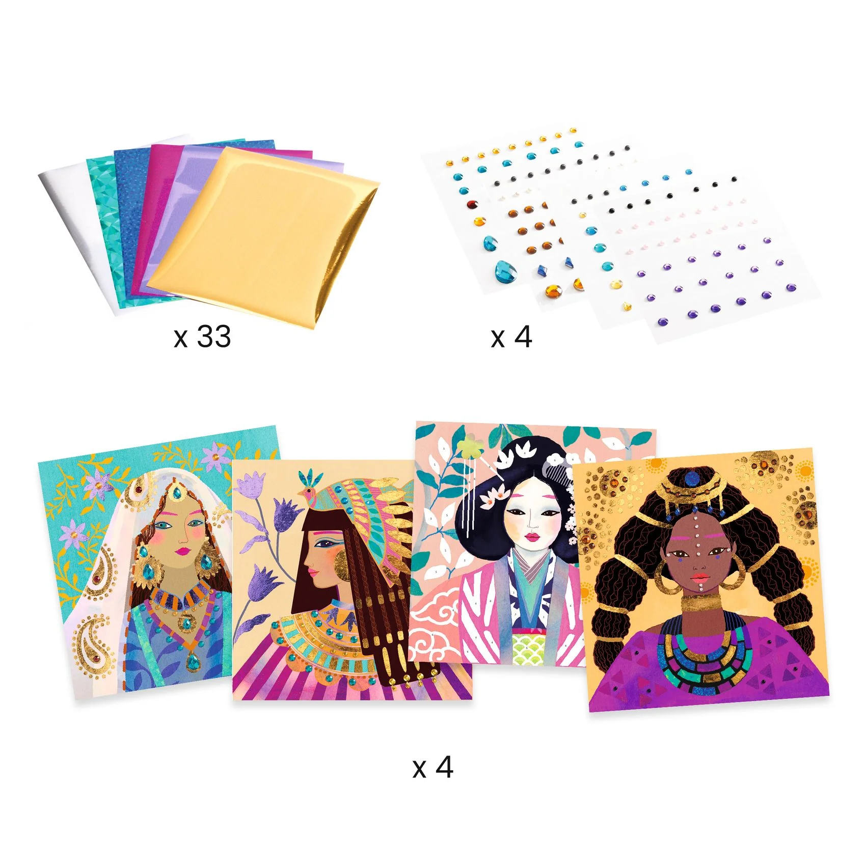 ما عليك سوى كشف المناطق اللاصقة لنقل الرقائق المعدنية وتثبيت الأحجار الصغيرة، لتكوين تصاميم جميلة ودقيقة على 4 لوحات مختلفة.